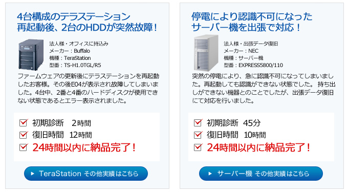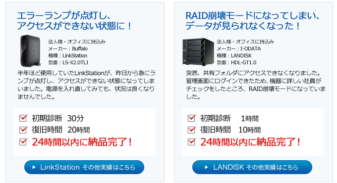 弊社では、RAID専門のアドバイザ−や機器・色々な障害状況に対応出来るスタッフが多数おりますので、まずはお気軽にお電話頂き無料の診断をオススメ致します。 |