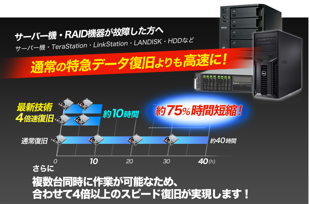 データ復旧専門10 年以上の経験で培った高度な技術と、信頼のサービスでお選びいただいております。出張サービスを業界内でもいち早くスタートさせ、お客様のニーズに合わせたサービスでご満足いただいております。