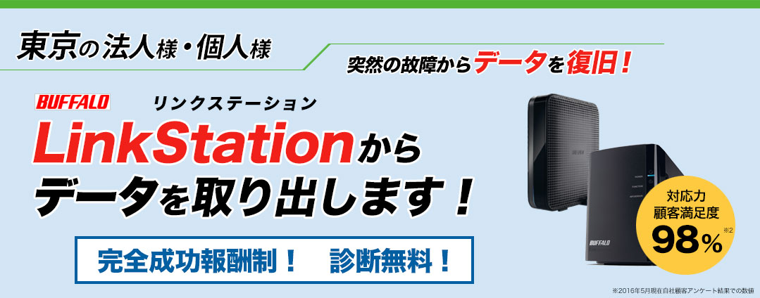 故障していたBuffaloのLinkStationはHDDに物理的障害がありましたが、専用機器にてなんとか現地出張対応が可能と判断。磁気情報の転写を行い、データの解析、抽出を行いました。HDDに複数の不良セクターがありましたが、データ領域は完全な状態で取得出来た為、100%のデータ復旧を行い、現場にてデータをお渡しいたしました。