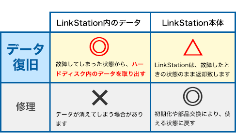 そのため、「必要なデータがLinkStation内に残ったまま」「バックアップが取れていない」等の場合は、データ復旧を行ってから修理を依頼されることをお勧めします。