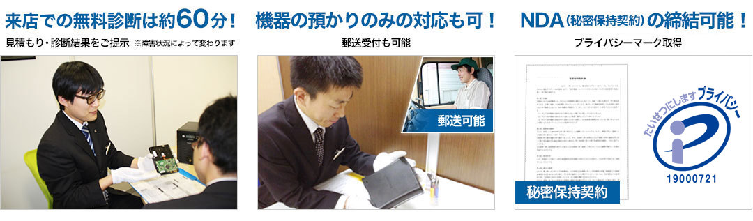 当社の6都市にある店舗(札幌・東京・横浜・名古屋・大阪・福岡)、全国の受付センターにて対応が可能です。店頭では、データ復旧のご相談を伺い、専門スタッフがお客様のご要望に合わせたデータ復旧サービスをご提案いたします。