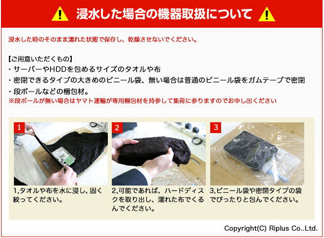 PCやNAS機器・サーバ機などが水没した場合、電源を入れずに下記方法で保存を行ってください。
