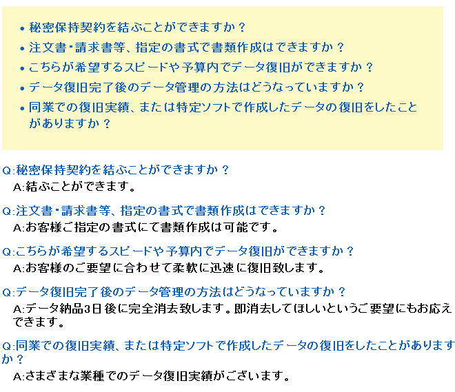 はじめにフリーダイヤルにお電話しましたが、こちらの困っている事項に対して丁寧にお答えいただきました。 障害状況から復旧の手順、納期まで丁寧にご対応いただきました。 機密データということもあり、御社スタッフ様とのやり取りにて払拭できました。 今後も機会がありましたらよろしくお願いいたします。 (株式会社S様)