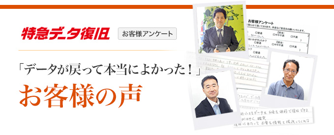今回のことにより、データのバックアップの重要性を感じました。また、予想していた値段もよりも安く済み良かったです。速くデータ復旧していただき、ありがとうございました。